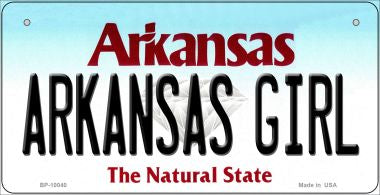 Arkansas Girl Novelty Metal Bicycle Plate. 3" x 6" high gloss aluminum metal bicycle plate. Made of the highest quality aluminum for a weather resistant finish. It is lightweight & durable. Proudly made in the USA.