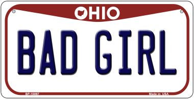 Bad Girl Ohio Novelty Metal Bicycle Plate. 3" x 6" high gloss aluminum metal bicycle plate. Made of the highest quality aluminum for a weather resistant finish. It is lightweight & durable. Proudly made in the USA.