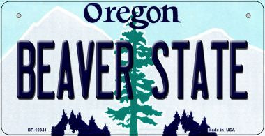 Beaver State Oregon Novelty Metal Bicycle Plate. 3" x 6" high gloss aluminum metal bicycle plate. Made of the highest quality aluminum for a weather resistant finish. It is lightweight & durable. Proudly made in the USA.