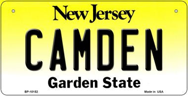 Camden New Jersey Novelty Metal Bicycle Plate. 3" x 6" high gloss aluminum metal bicycle plate. Made of the highest quality aluminum for a weather resistant finish. It is lightweight & durable. Proudly made in the USA.