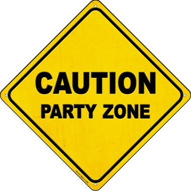 Caution Party Zone Novelty Metal Crossing Sign. 16.5"X16.5" metal crossing sign, 12"x12" square size. Made of the highest quality aluminum for a weather resistant finish. It is lightweight and durable and has pre-drilled holes for quick and easy mounting. Personalize with ribbon, wire or string. Individually shrink-wrapped and proudly made in the USA.