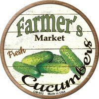 Farmers Market Cucumber Novelty Metal Mini Circle Magnet. 3.5" x 3.5" high gloss metal mini circle with magnet on the back. Made of the highest quality aluminum for a weather resistant finish. It is lightweight & durable. Proudly made in the USA.