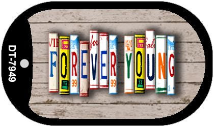 Forever Young Plate Art Novelty Metal Dog Tag Necklace DT-7949. 1" x 2" Novelty Metal Dog Tag Necklace including 15" silver chain and silencer. Made of the highest quality aluminum for a weather resistant finish. It is lightweight & durable. Proudly made in the USA.