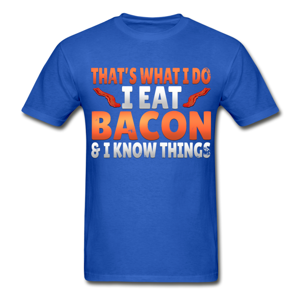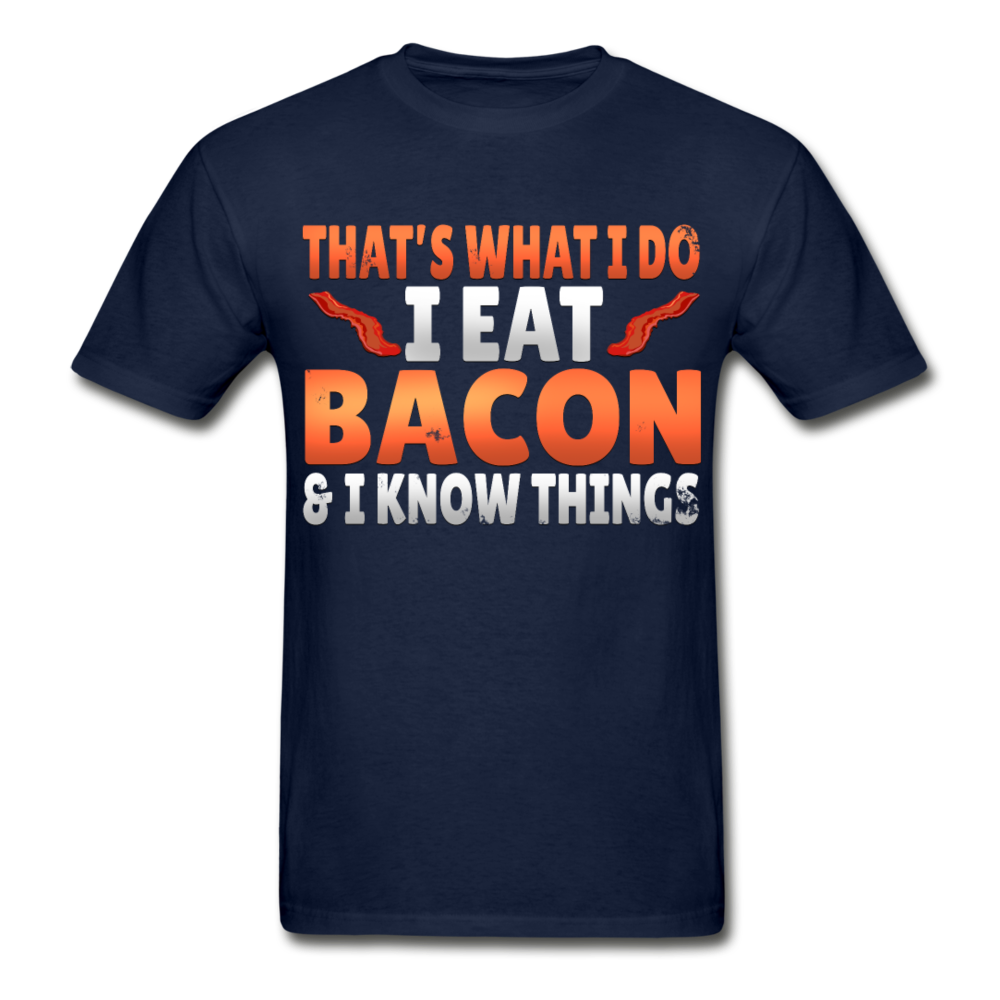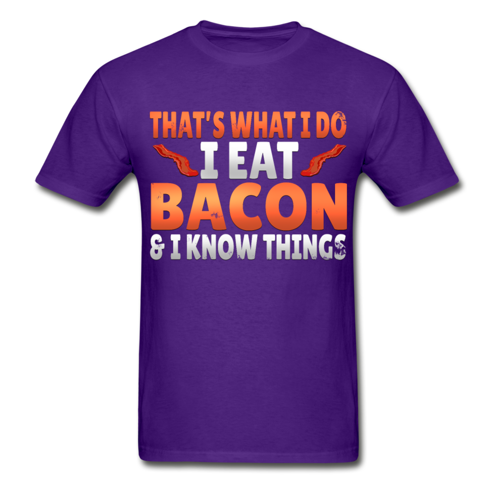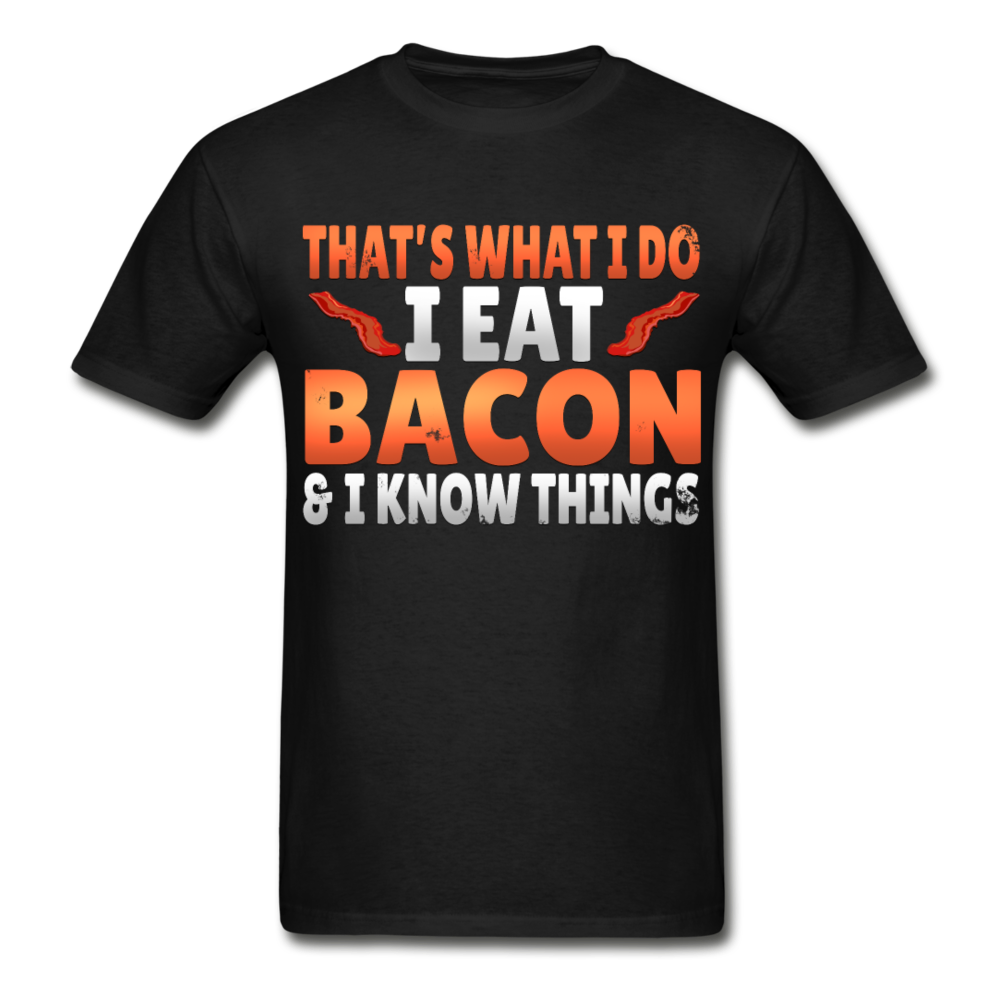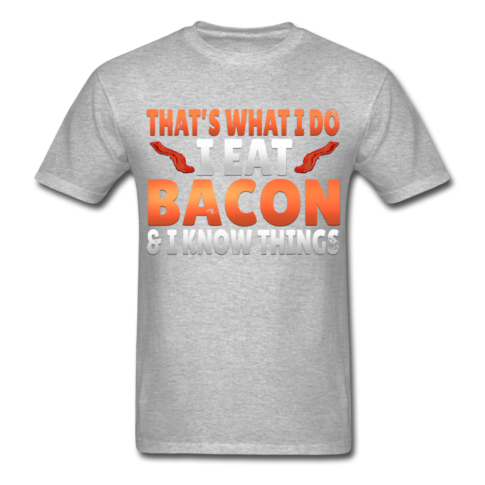 This funny that's what I do, I eat bacon and know things t-shirt is a perfect gift idea for any gift giving occasion for lovers of yummy bacon, wear this humorous t-shirt when out eating crispy yummy bacon. If you or someone you know are a bacon lover and could eat bacon for breakfast, lunch, and dinner, then this funny that's what I do, I eat bacon and know things, themed design is just for you. So, do you like what you see? Go ahead and buy this funny I Eat Bacon And Know Things Bacon Lover T-shirt apparel right now today.
