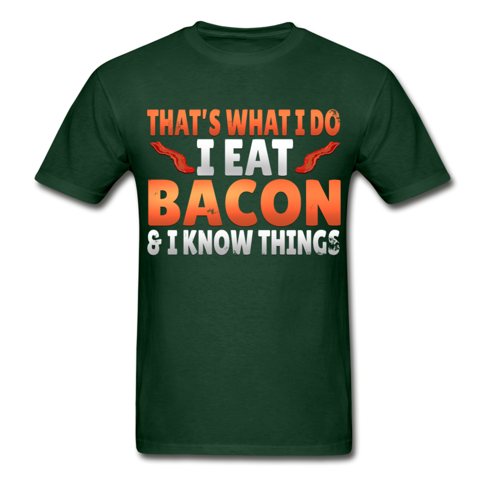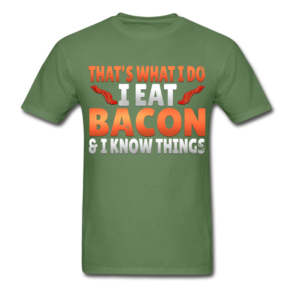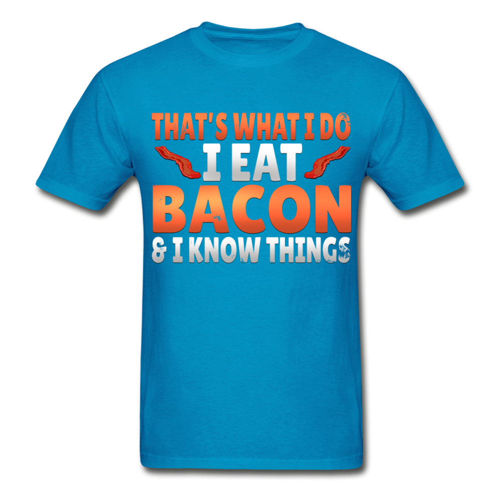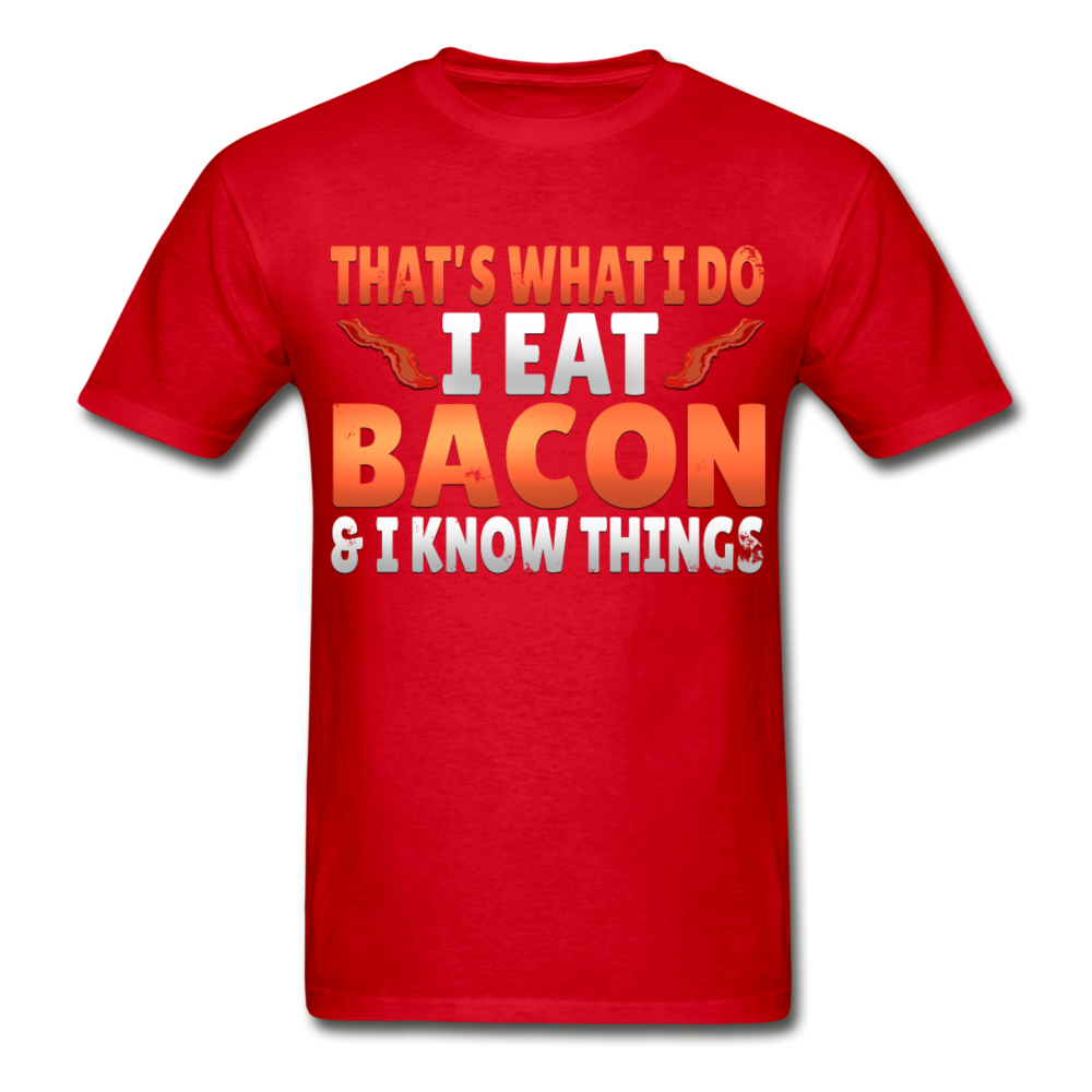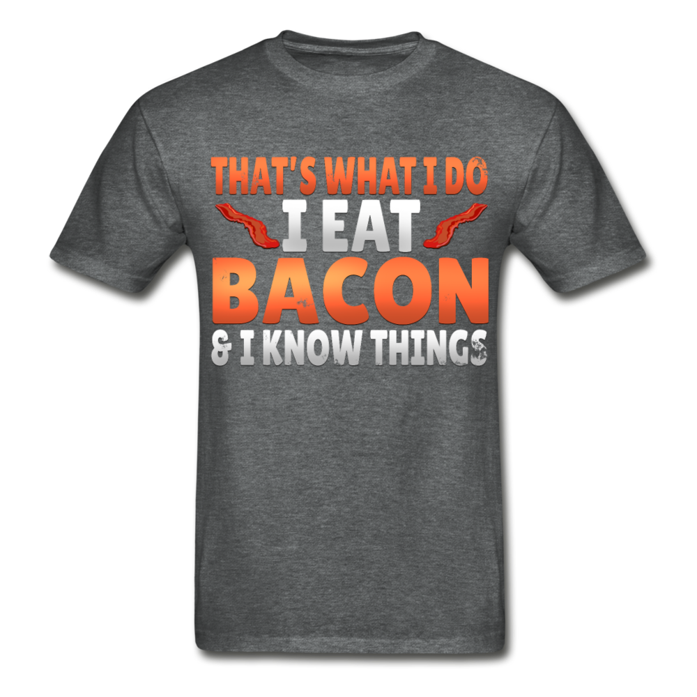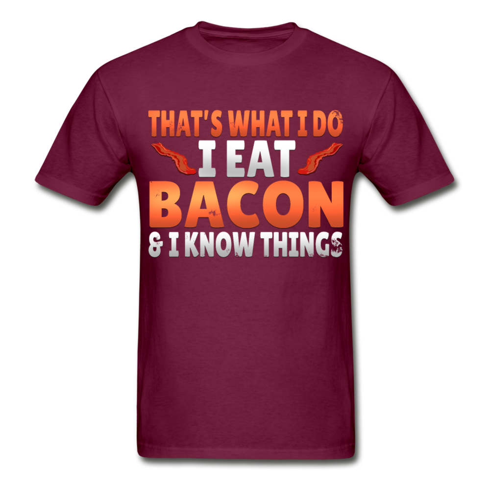This funny that's what I do, I eat bacon and know things t-shirt is a perfect gift idea for any gift giving occasion for lovers of yummy bacon, wear this humorous t-shirt when out eating crispy yummy bacon. If you or someone you know are a bacon lover and could eat bacon for breakfast, lunch, and dinner, then this funny that's what I do, I eat bacon and know things, themed design is just for you. So, do you like what you see? Go ahead and buy this funny I Eat Bacon And Know Things Bacon Lover T-shirt apparel right now today.
