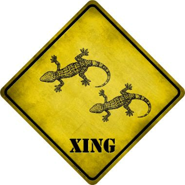 Gecko Xing Novelty Crossing Sign. 16.5"X16.5" metal crossing sign, 12"x12' square size.Made of the highest quality aluminum for a weather resistant finish. It is lightweight and durable and has pre-drilled holes for quick and easy mounting. Personalize with ribbon, wire or string. Individually shrink-wrapped and proudly made in the USA.