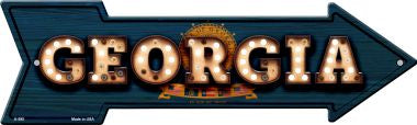 Georgia Bulb Lettering With State Flag Novelty Arrows. 5" X 17" Arrow Sign. Made of the highest quality aluminum for a weather resistant finish. It is lightweight and durable. Pre-drilled holes for quick and easy mounting. Each is proudly made in the USA.