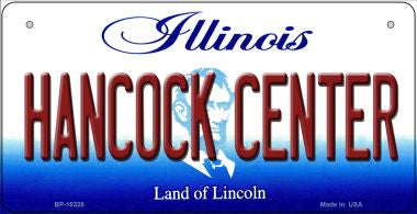 Hancock Center Illinois State License Plate Bicycle Plate BP-10328. 3" x 6" high gloss aluminum metal bicycle plate. Made of the highest quality aluminum for a weather resistant finish. It is lightweight & durable. Proudly made in the USA.