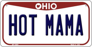 Hot Mama Ohio Novelty Metal Bicycle Plate BP-10081. 3" x 6" high gloss aluminum metal bicycle plate. Made of the highest quality aluminum for a weather resistant finish. It is lightweight & durable. Proudly made in the USA.