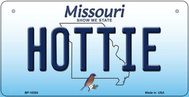 Hottie Missouri Novelty Metal Bicycle Plate BP-10254. 3" x 6" high gloss aluminum metal bicycle plate. Made of the highest quality aluminum for a weather resistant finish. It is lightweight & durable. Proudly made in the USA.
