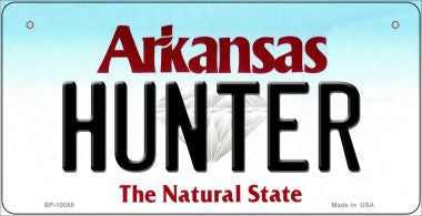 Hunter Arkansas Novelty Metal Bicycle Plate BP-10058. 3" x 6" high gloss aluminum metal bicycle plate. Made of the highest quality aluminum for a weather resistant finish. It is lightweight & durable. Proudly made in the USA.