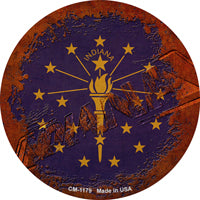 Indiana Rusty Stamped Novelty Circle Coaster Set of 4. 3.5" Circle Coaster Set of 4. Each coaster has cork adhered to the back to provide surface protection for use on desks, tables, and shelves. Made of the highest quality aluminum with a weather resistant finish. Proudly made in the USA.