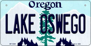 Lake Oswego Oregon Novelty Metal Bicycle Plate BP-10351. 3" x 6" high gloss aluminum metal bicycle plate. Made of the highest quality aluminum for a weather resistant finish. It is lightweight & durable. Proudly made in the USA.
