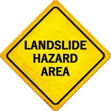 Landslide Hazard Area Novelty Metal Crossing Sign CX-393. 16.5"X16.5" metal crossing sign, 12"x12' square size. Made of the highest quality aluminum for a weather resistant finish. It is lightweight and durable and has pre-drilled holes for quick and easy mounting. Personalize with ribbon, wire or string. Individually shrink-wrapped and proudly made in the USA. Individually shrink wrapped w/ drilled holes for quick and easy reseller display as well as for customer mounting.