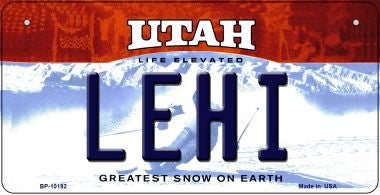 Lehi Utah Novelty Metal Bicycle Plate BP-10192. 3" x 6" high gloss aluminum metal bicycle plate. Made of the highest quality aluminum for a weather resistant finish. It is lightweight & durable. Proudly made in the USA.