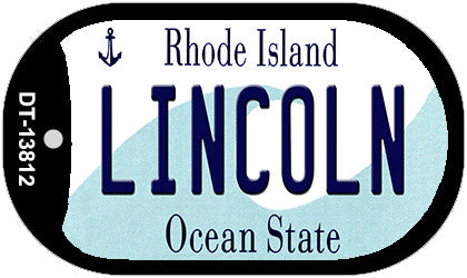 Lincoln Rhode Island Novelty Metal Dog Tag Necklace. 1" x 2" dog tag kit including 15" silver chain and silencer. Made of the highest quality aluminum for a weather resistant finish. It is lightweight and durable. Individually shrink-wrapped and proudly made in the USA.