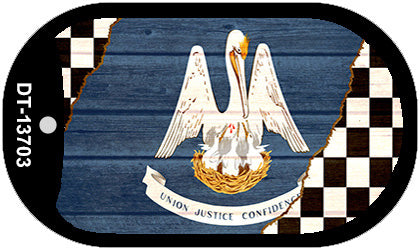 Louisiana Racing Flag Novelty Metal Dog Tag Necklace DT-13703. 1.5" x 2" dog tag kit including 15" silver chain and silencer. Made of the highest quality aluminum for a weather resistant finish. It is lightweight and durable. Individually shrink-wrapped and proudly made in the USA.