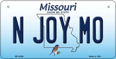 N Joy MO Missouri Novelty Metal Bicycle Plate BP-10248. 3" x 6" high gloss aluminum metal bicycle plate. Made of the highest quality aluminum for a weather resistant finish. It is lightweight & durable. Proudly made in the USA.