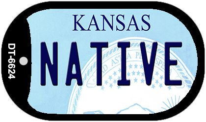 Native Kansas Novelty Metal Dog Tag Necklace DT-6624. 1" x 2" dog tag kit including 15" silver chain and silencer. Made of the highest quality aluminum for a weather resistant finish. It is lightweight & durable. Proudly made in the USA.