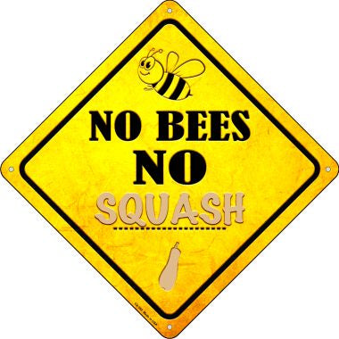 No Bees No Squash Novelty Crossing Sign CX-350. 16.5"x16.5" metal crossing sign, 12"x12" square size. Made of the highest quality aluminum for a weather resistant finish. It is lightweight and durable and has pre-drilled holes for quick and easy mounting. Personalize with ribbon, wire or string. Individually shrink-wrapped and proudly made in the USA. Each Item Comes Ready to Sell. Individually shrink wrapped w/ drilled holes for quick and easy reseller display as well as for customer mounting.