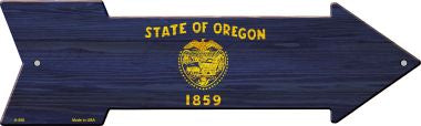Oregon State Flag Novelty Arrows. 5" X 17" Arrow Sign. Made of the highest quality aluminum for a weather resistant finish. It is lightweight and durable. Pre-drilled holes for quick and easy mounting. Each is proudly made in the USA.