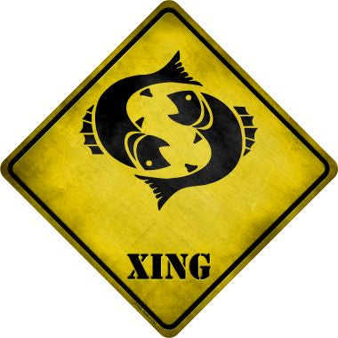Pisces Zodiac Animal Xing Novelty Metal Crossing Sign. 16.5"X16.5" metal crossing sign, 12"x12' square size. Made of the highest quality aluminum for a weather resistant finish. It is lightweight and durable and has pre-drilled holes for quick and easy mounting. Personalize with ribbon, wire or string. Individually shrink-wrapped and proudly made in the USA.