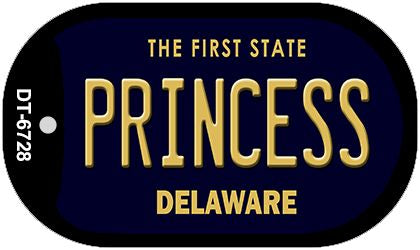 Princess Delaware Novelty Metal Dog Tag Necklace DT-6728. 1" x 2" dog tag kit including 15" silver chain and silencer. Made of the highest quality aluminum for a weather resistant finish. It is lightweight & durable. Proudly made in the USA.