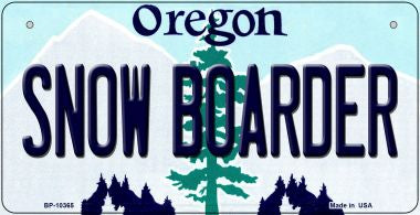 Snow Boarder Oregon Novelty Metal Bicycle Plate BP-10365. 3" x 6" high gloss aluminum metal bicycle plate. Made of the highest quality aluminum for a weather resistant finish. It is lightweight & durable. Proudly made in the USA.