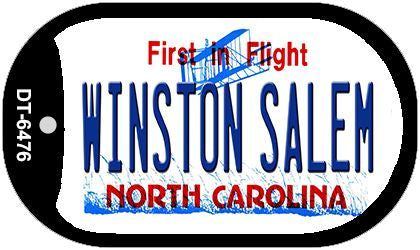 Winston Salem North Carolina Novelty Metal Dog Tag Necklace DT-6476. 1" x 2" dog tag kit including 15" silver chain and silencer. Made of the highest quality aluminum for a weather resistant finish. It is lightweight & durable. Proudly made in the USA.