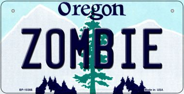 Zombie Oregon Novelty Metal Bicycle Plate. 3" x 6" high gloss aluminum metal bicycle plate. Made of the highest quality aluminum for a weather resistant finish. It is lightweight & durable. Proudly made in the USA.